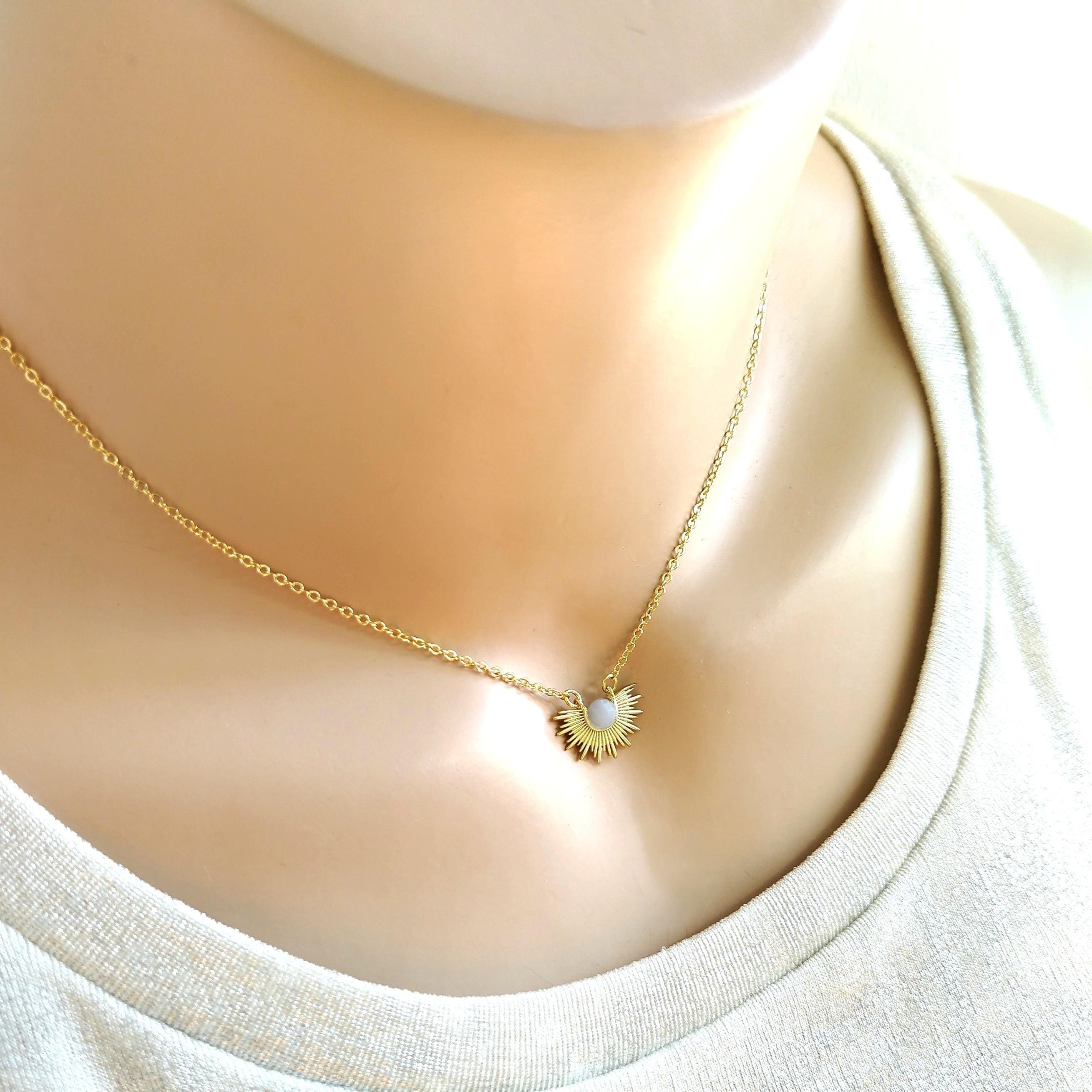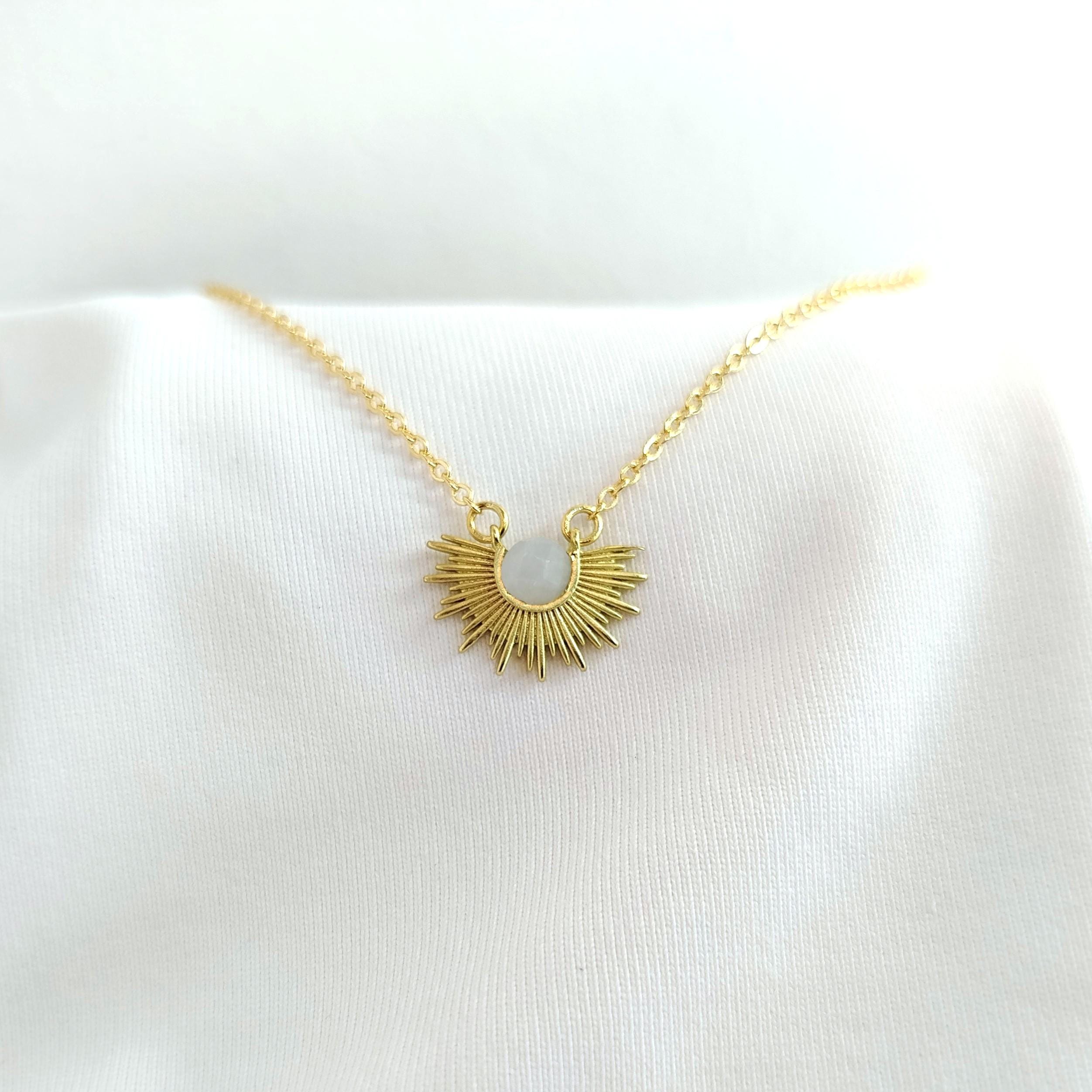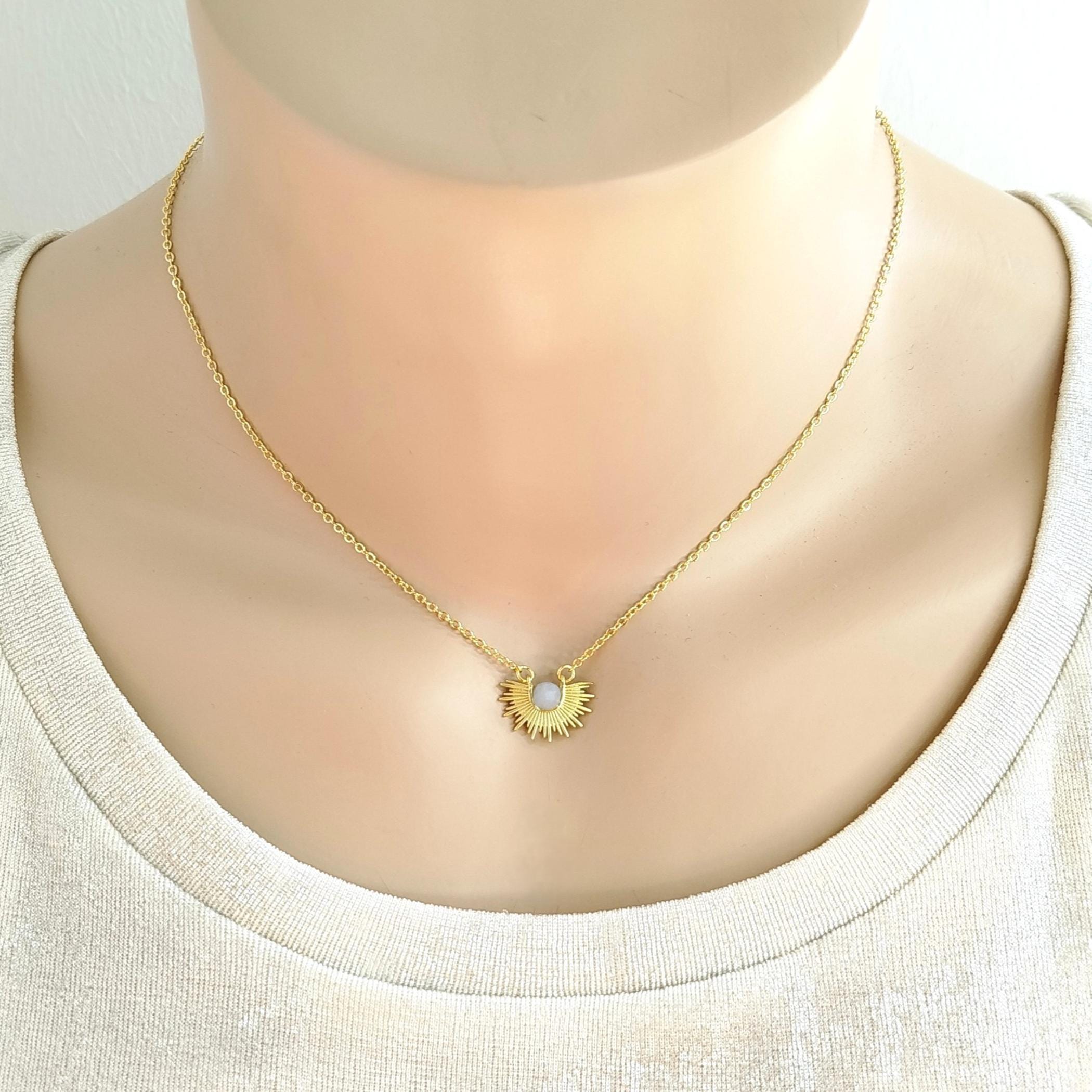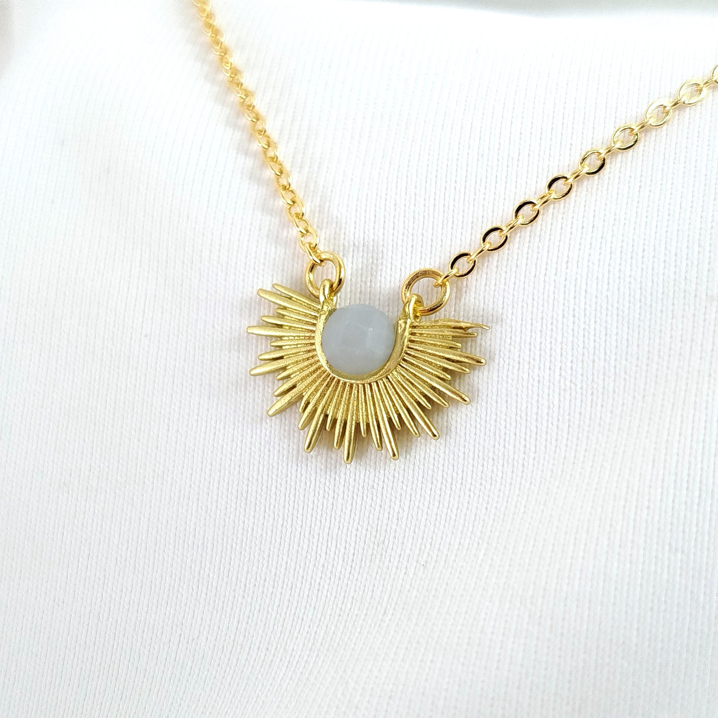 ⭐ A dainty angelite stone in a half sun pendant is perfect for carrying this calming gemstone presented in a faceted round style. Angelite is known for its gentle and soothing energy, promoting peace, tranquility, and connection with higher realms. This makes it a meaningful piece for everyday wear or as a thoughtful gift.